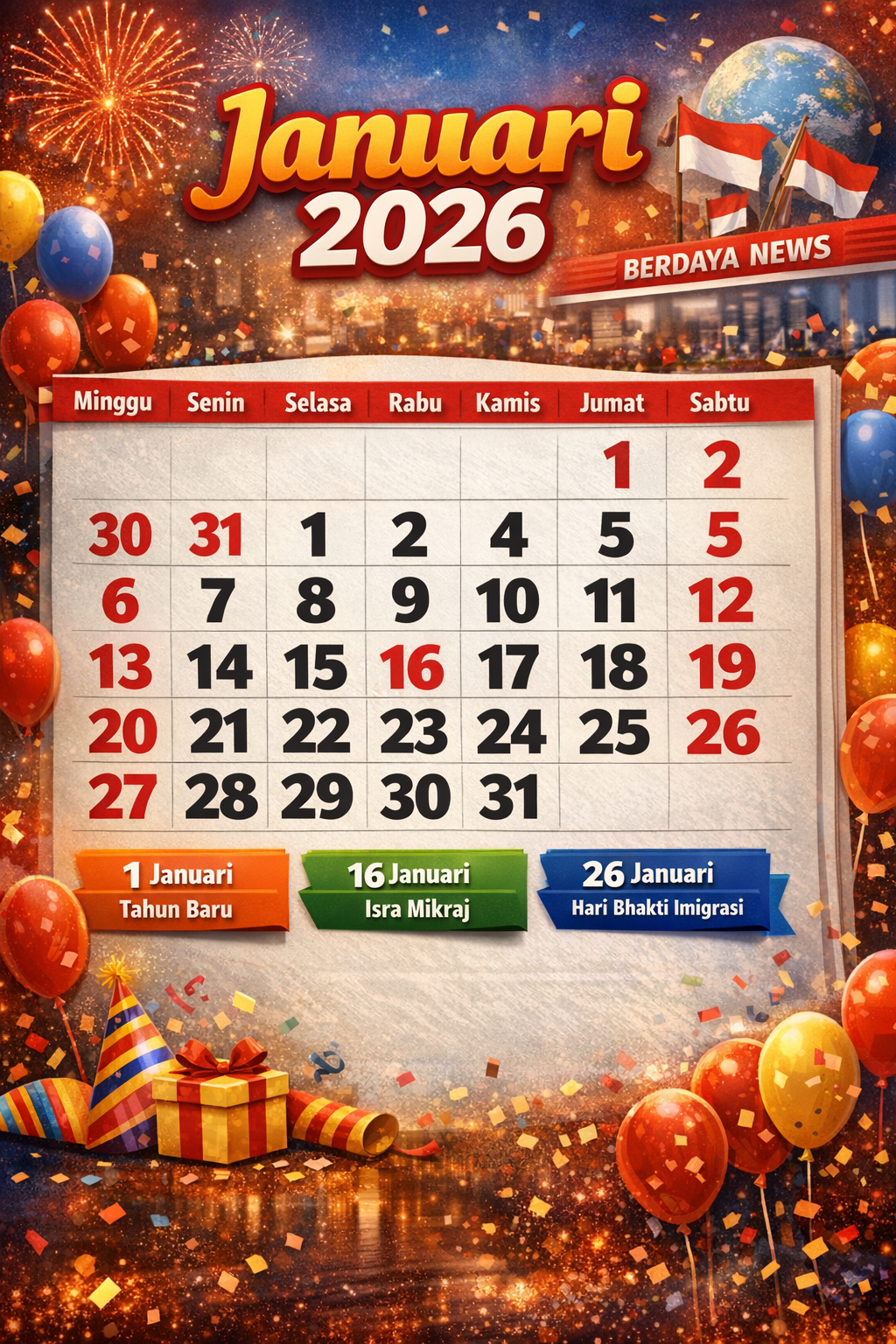 BerdayaNews.com, Kalender — Memasuki tahun baru 2026, bulan Januari hadir bukan sekadar sebagai awal lembaran kalender, tetapi juga bulan yang sarat peringatan penting—baik nasional maupun internasional. Sebagian di antaranya ditandai tanggal merah, sementara lainnya tetap diperingati secara luas karena membawa pesan sejarah, kemanusiaan, hingga kepedulian global.