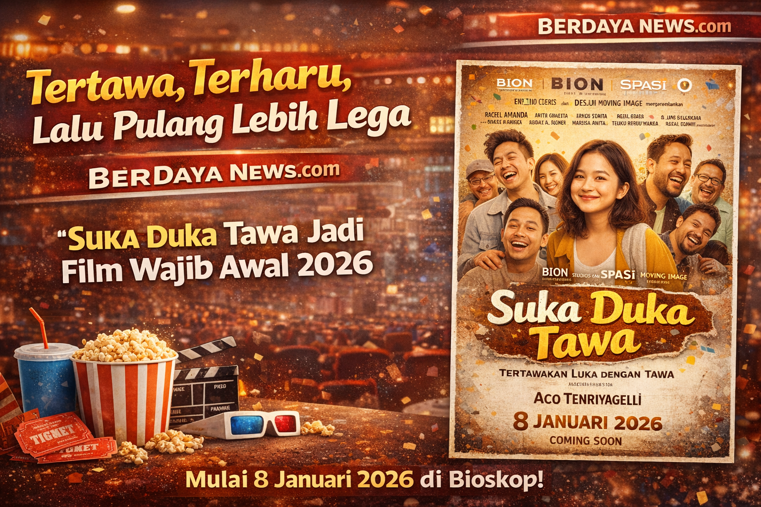 BerdayaNews.com — Awal tahun biasanya identik dengan resolusi, tapi 2026 dibuka dengan tawa yang menyembuhkan. Suka Duka Tawa, film debut sutradara Aco Tenriyagelli, siap mengajak penonton menertawakan luka-luka lama sebelum melangkah ke tahun yang baru.Diproduksi oleh BION Studios bersama Spasi Moving Image, film drama komedi keluarga ini langsung mendapat sambutan hangat dan antusias sejak press screening. Bukan sekadar hiburan pembuka tahun, Suka Duka Tawa terasa seperti ruang refleksi kolektif—tempat tawa dan air mata berdamai.