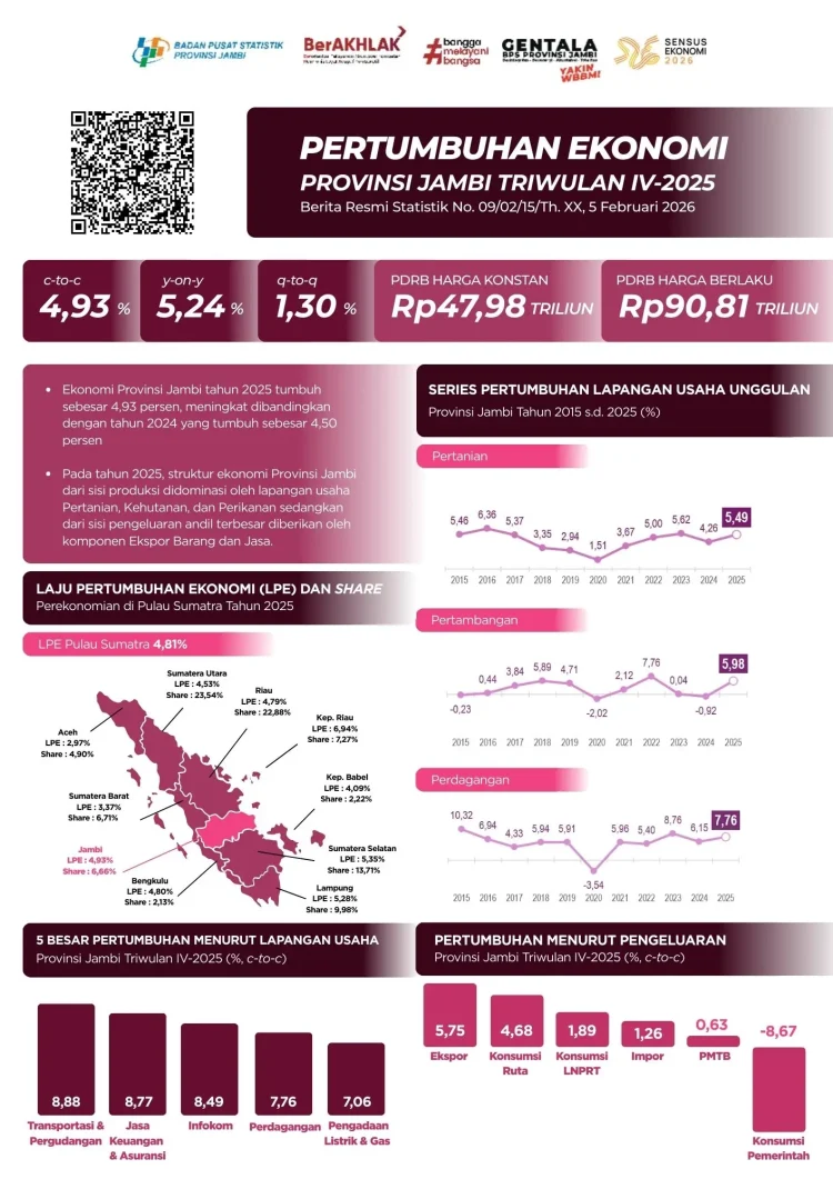 ​Kepala BPS Provinsi Jambi mencatat ekonomi Jambi secara kumulatif tahun 2025 tumbuh sebesar 4,93 persen (c-to-c). Pertumbuhan tertinggi dari sisi produksi dicapai oleh lapangan usaha Transportasi dan Perdagangan yang melonjak hingga 8,88 persen.