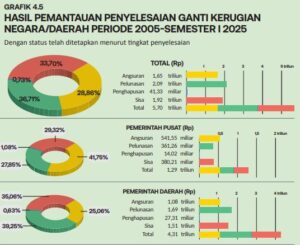 BerdayaNews.com, Jakarta – Ikhtisar Hasil Pemeriksaan Semester (IHPS) I Tahun 2025 yang baru saja dirilis mengungkap fakta mengejutkan mengenai kebocoran anggaran di berbagai lini institusi negara. Berdasarkan hasil pemantauan penyelesaian ganti kerugian periode 2005 hingga Semester I 2025, total kerugian negara yang telah ditetapkan mencapai angka fantastis: Rp5,70 Triliun.