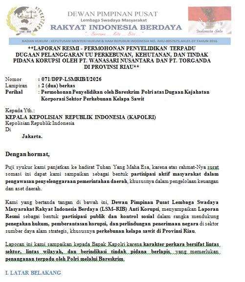 BerdayaNews.com, Bekasi – Dewan Pimpinan Pusat Lembaga Swadaya Masyarakat Rakyat Indonesia Berdaya (DPP LSM RIB) Anti Korupsi resmi melayangkan laporan dugaan kerugian negara dan permohonan penegakan hukum kepada Kapolri. Laporan tersebut menyoroti praktik mafia tanah dan manipulasi kewajiban perpajakan yang diduga dilakukan oleh dua perusahaan perkebunan kelapa sawit besar di wilayah Riau, yakni PT Wanasari Nusantara dan PT Torganda.