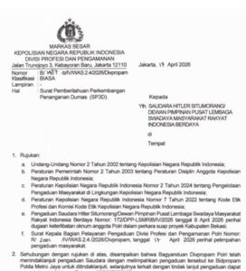Ketua Umum LSM RIB, Hitler Situmorang, mengungkapkan bahwa pihaknya telah menerima Surat Pemberitahuan Perkembangan Hasil Pemeriksaan Dumas (SP3D) dengan nomor B/1487-b/IV/WAS.2.4/2026/Divpropam. Dalam surat tersebut, Kadiv Propam Mabes Polri secara resmi melimpahkan penanganan perkara ke Bidpropam Polda Metro Jaya.